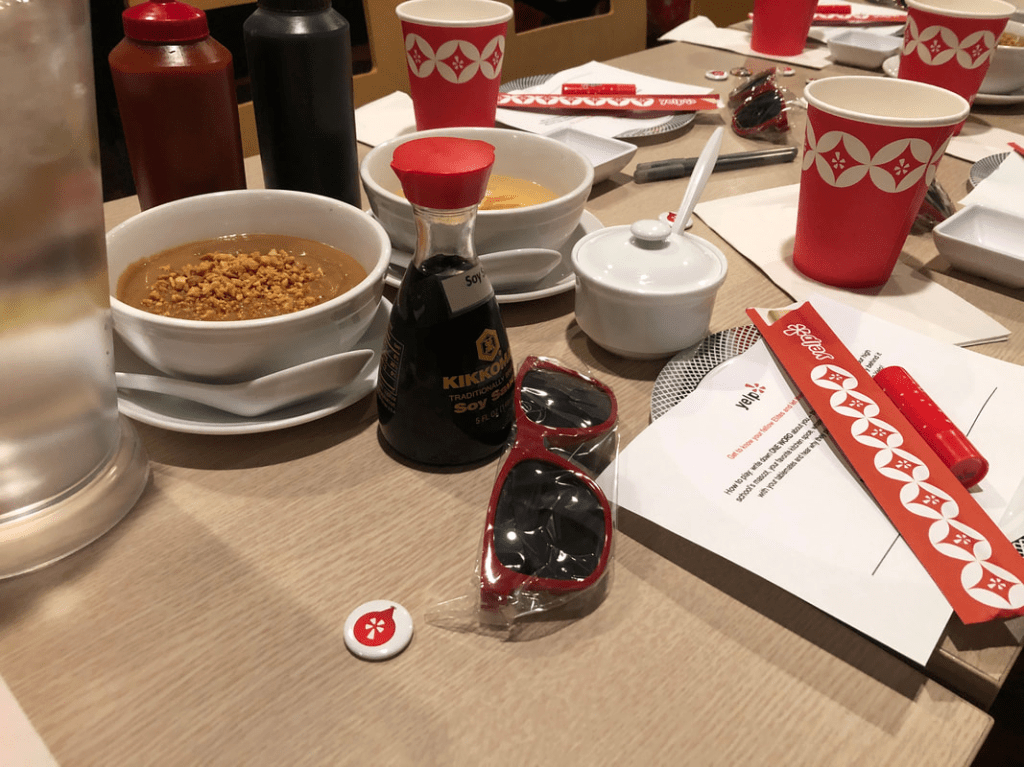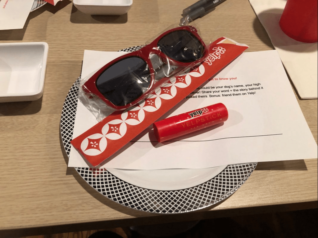 Also, look how cute this place setting is! Such fun goodies and the Yelp chopsticks are a great touch! (The chapstick also smells amazing btw)