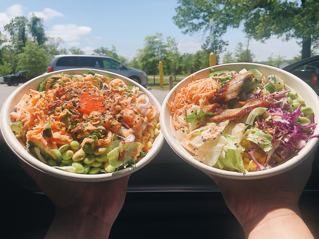 My bowl (left): white rice/mixed greens, salmon in house sauce, spicy crab, edamame, cucumber, seaweed salad, corn, red onions, avocado, masago, sesame seeds, and fried onions.