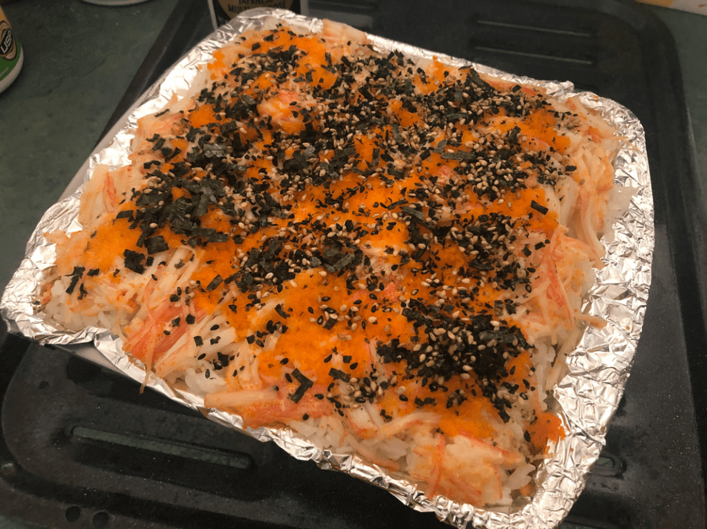 Then, I mixed in about 4 tbsp of spicy mayo mix with 4 tbsp of masago. This amount is really up to your liking, but I always opt for more mayo because it tends to dry out in the oven and the cropper it is, the better!