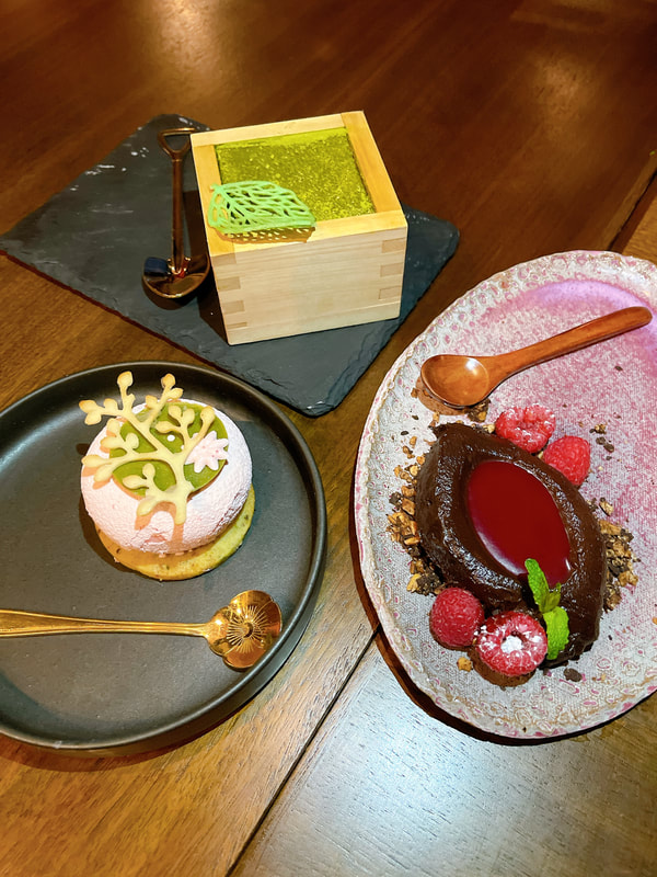 Finally, we finish with the best course, obvi…dessert! The vegan option came with the vegan chocolate ganache cake and the regular omakase had the choice to choose their dessert. Our friends ordered the Nara-Ya famous green tea matcha-misu and the Sakura garden.